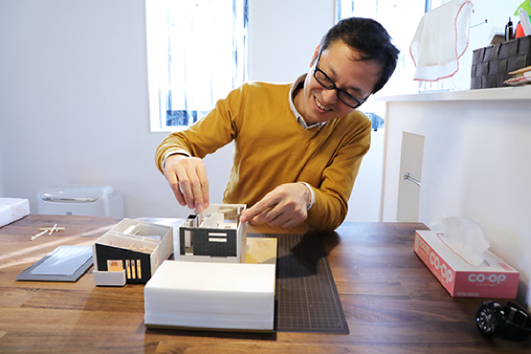 宅地状況から三階建てとして図面を描いて頂いたのですが、私も少し凝り性なところがありまして、図面から五〇分の一模型を自作して打ち合わせしました。3D画像はよく見られると思いますが、想像だけよりも実際に模型でドアや床の色を変えてみるとよりわかりやすいですよ。お陰様で電球一個からタイル一つまで希望通りになり、断熱・気密などの性能も抜群の家となりました。
