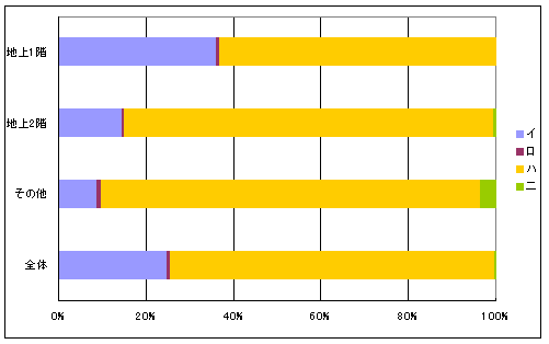 c.a及びbに掲げるもの以外のもの イ ロ ハ ニ 合計 地上1階 戸数 1,269 3 7,315 17,928 26,515 % 4.8% 0.0% 27.6% 67.6% 100.0% 地上2階 戸数 301 7 24,602 420 25,330 % 1.2% 0.0% 97.1% 1.7% 100.0% その他 戸数 15 10 1,623 647 2,295 % 0.7% 0.4% 70.7% 28.2% 100.0% 全体 戸数 1,585 20 33,540 18,995 54,140 % 2.9% 0.0% 62.0% 35.1% 100.0%