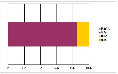 等級3 火炎を遮る時間が60分相当以上 等級2 火炎を遮る時間が20分相当以上 等級1 その他 該当なし 等級1 等級2 等級3 合計 戸数 119 43,579 7,761 2 51,461 % 0.2% 84.7% 15.1% 0.0% 100.0%