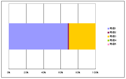 等級5 高齢者等が安全に移動することに特に配慮した措置が講じられており、介助用車いす使用者が基本的な生活行為を行うことを容易にすることに特に配慮した措置が講じられている 等級4 高齢者等が安全に移動することに配慮した措置が講じられており、介助用車いす使用者が基本的な生活行為を行うことを容易にすることに配慮した措置が講じられている 等級3 高齢者等が安全に移動するための基本的な措置が講じられており、介助用車いす使用者が基本的な生活行為を行うための基本的な措置が講じられている 等級2 高齢者等が安全に移動するための基本的な措置が講じられている 等級1 住戸内において、建築基準法に定める移動時の安全性を確保する措置が講じられている 等級1 等級2 等級3 等級4 等級5 合計 戸数 34,892 860 15,672 37 0 51,461 % 67.8% 1.7% 30.5% 0.1% 0.0% 100.0%
