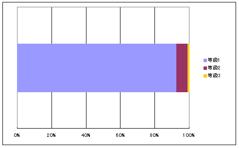 等級3 稀に(数十年に一度程度)発生する地震による力(建築基準法施行令第88条第2項に定めるもの)の1.5倍の力に対して損傷を生じない程度 等級2 稀に(数十年に一度程度)発生する地震による力(建築基準法施行令第88条第2項に定めるもの)の1.25倍の力に対して損傷を生じない程度 等級1 稀に(数十年に一度程度)発生する地震による力(建築基準法施行令第88条第2項に定めるもの)に対して損傷を生じない程度 等級1 等級2 等級3 合計 戸数 128,600 9,282 1,506 139,388 % 92.3% 6.7% 1.1% 100.0%