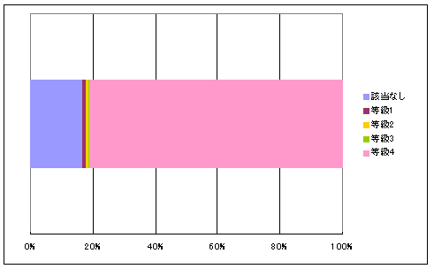 等級4 火熱を遮る時間が60分相当以上 等級3 火熱を遮る時間が45分相当以上 等級2 火熱を遮る時間が20分相当以上 等級1 その他 該当なし 等級1 等級2 等級3 等級4 合計 戸数 23,090 1,889 873 652 112,884 139,388 % 16.6% 1.4% 0.6% 0.5% 81.0% 100.0%