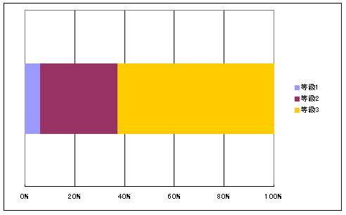 等級3 通常想定される自然条件及び維持管理の条件の下で3世代(おおむね75〜90年)まで、大規模な改修工事を必要とするまでの期間を伸長するため必要な対策が講じられている 等級2 通常想定される自然条件及び維持管理の条件の下で2世代(おおむね50〜60年)まで、大規模な改修工事を必要とするまでの期間を伸長するため必要な対策が講じられている 等級1 建築基準法に定める対策が講じられている 等級1 等級2 等級3 合計 戸数 8,831 43,112 87,445 139,388 % 6.3% 30.9% 62.7% 100.0%