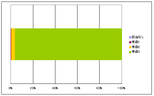 等級3 ホルムアルデヒドの発散量が極めて少ない(日本工業規格又は日本農林規格のF☆☆☆☆等級相当以上) 等級2 ホルムアルデヒドの発散量が少ない(日本工業規格又は日本農林規格のF☆☆☆等級相当以上) 該当なし 等級2 等級3 合計 戸数 199 17,060 117,376 134,635 % 0.1% 12.7% 87.2% 100.0%