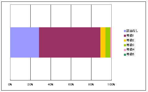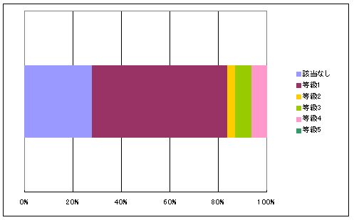 該当なし 等級1 等級2 等級3 等級4 等級5 合計 戸数 1,133 2,473 200 190 54 0 4,050 % 28.0% 61.1% 4.9% 4.7% 1.3% 0.0% 100.0%
