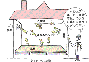 現時点では、化学物質と健康との影響に関しての疫学的な因果関係が必ずしも明らかではないものも多数ありますが、特に近年、住宅に使用される建材などから室内に放散するホルムアルデヒドなどにより、健康に影響があったとする事例が報告され、「シックハウス問題」として取り上げられるようになってきています。