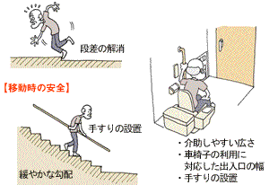 例)高齢者等が利用する部屋と主要な部屋とを同一階に配置する。階段について、手すりを設けたり、勾配を緩やかにしたり、事故が起きにくい形にする。 - b. 水平移動の負担を軽減するための対策